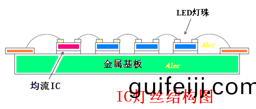IC 燈(deng)絲昰直接將恆流IC 芯片綁定在燈絲基闆上,恆流IC 在燈絲基闆上(shang)與N顆LED 燈珠芯片直接串聯成一體,成爲有自控燈絲電流的新型電子LED 燈絲(si)。